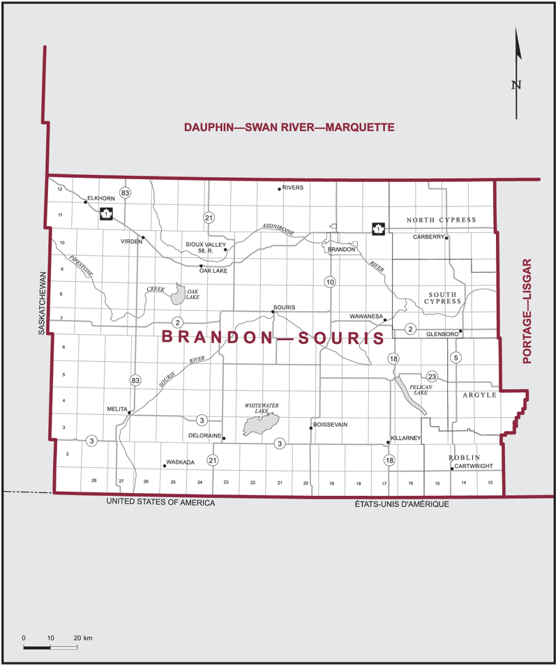 The electoral district of Brandon--Souris (Manitoba) covers an area of 19,836 km2, and has a population of 84,602 with 61,289 registered voters and 182 polling divisions.