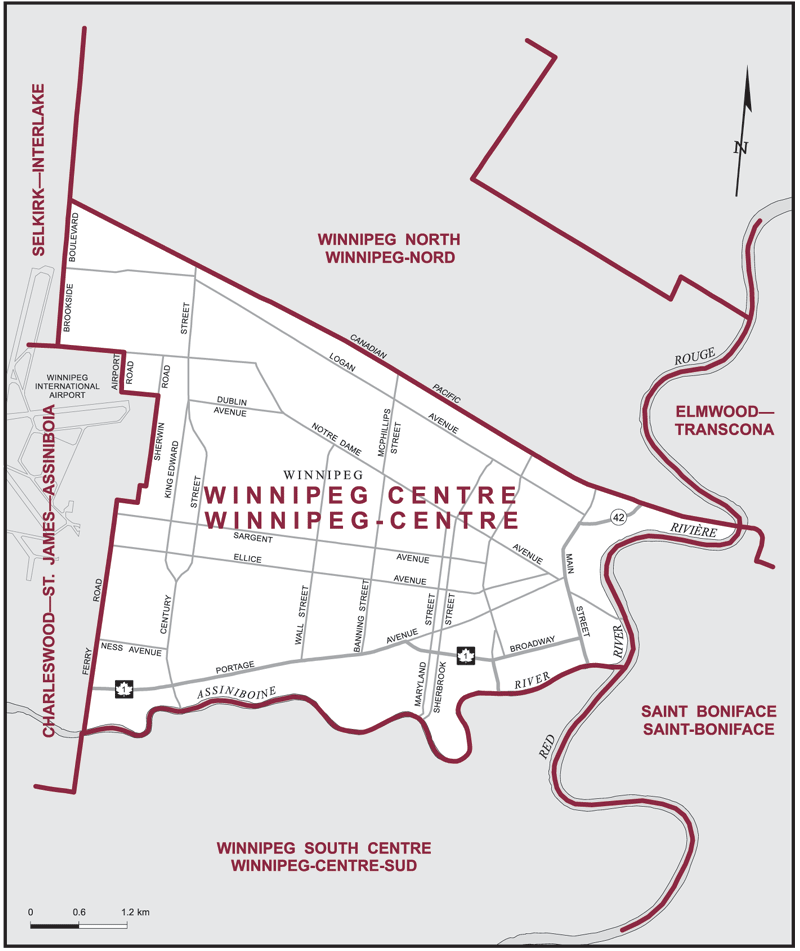 The electoral district of Winnipeg Centre (Manitoba) covers an area of 29 km2, and has a population of 81,017 with 54,364 registered voters and 147 polling divisions.