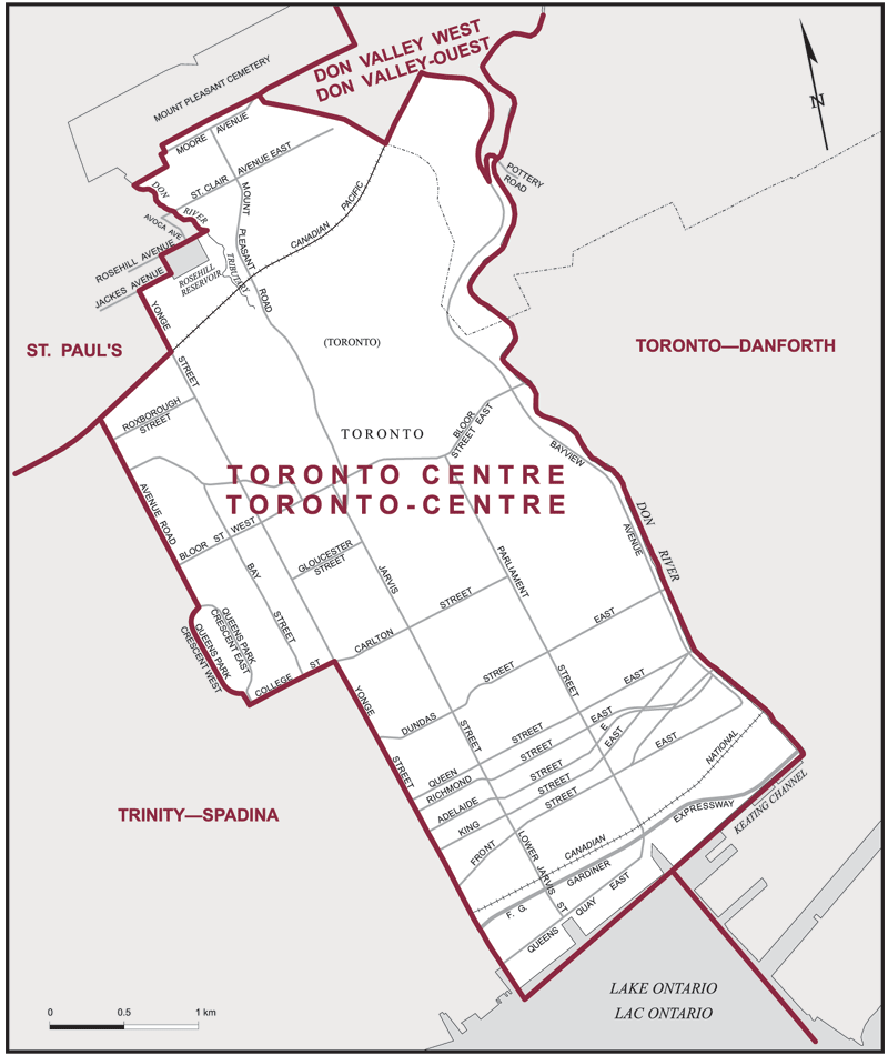 The electoral district of Toronto Centre (Ontario) covers an area of 0 km2, and has a population of 0 with 0 registered voters and 248 polling divisions.