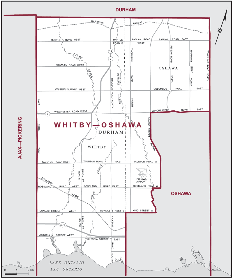 The electoral district of Whitby--Oshawa (Ontario) covers an area of 234 km2, and has a population of 146,307 with 103,125 registered voters and 245 polling divisions.