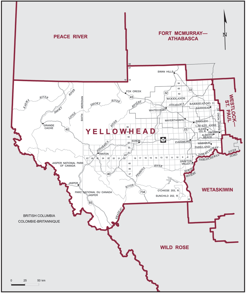The electoral district's boundaries are described as, consisting of that part of the Province of Alberta described as follows: commencing at the intersection of the west boundary of said province with the north boundary of Tp 64; thence east along the north boundary of Tp 64 to the west boundary of R 18 W 5; thence north along the west boundary of R 18 W 5 to the north boundary of Tp 67; thence east along the north boundary of Tp 67 to the east boundary of R 8 W 5; thence south along the east boundary of R 8 W 5 to the north boundary of Tp 64; thence east along the north boundary of Tp 64 to the easterly limit of Woodlands County; thence generally southerly along the easterly limits of said county, Barrhead County No. 11 and Lac Ste. Anne County to the northerly limit of Parkland County; thence generally southwesterly along said limit to Range Road 20; thence southerly along said road to the right bank of the North Saskatchewan River; thence generally southwesterly along said bank to the south boundary of Tp 42; thence west along the south boundary of Tp 42 to the southeasterly boundary of Jasper National Park of Canada; thence generally southwesterly along said boundary to the westerly boundary of said province; thence generally northwesterly and northerly along said boundary to the point of commencement.
